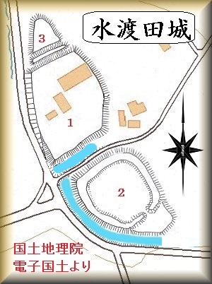 水渡田南端の台地。郭、堀、空堀、門跡などが残るという。