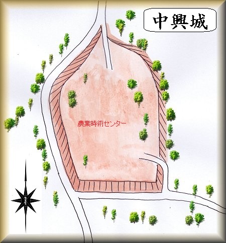 中興城も、平地の居館である。周囲の堀の跡が水田となって残っている。城址は水田面よりも1.5mほど高くなっている。