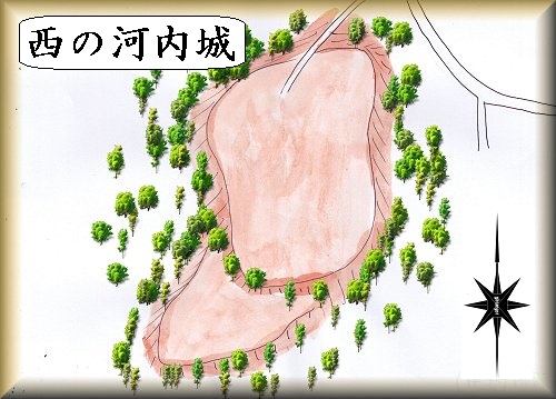 西の河内城は、正法寺の西500mほどの所にある。比高10mほどの山林化した低い台地が城址のようである。