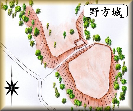 野方城は、西の河内城のすぐ西側に隣り合った比高5mほどの台地上にあった。この辺りを五丁弓(ごちょうのき)ともいうので、五丁弓(ごちょうのき)城とも呼ばれる。