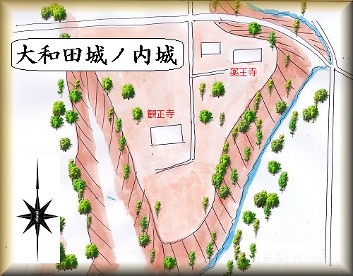 大和田城ノ内城のある城ノ内地区(大和田城ノ内城)。 観正寺のある三角形状の台地で、西側にも谷戸が入り込んでおり、北側を区画すれば城が成立する地形となっている。