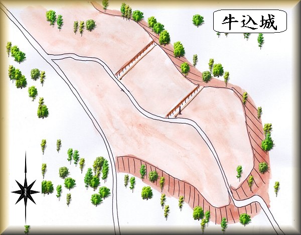 主郭部は方80mほどで畑地になっている。郭の下には一部に腰曲輪らしいものも認められる。地元の人に聞いたところ、「城址はその畑だよ」ということであったが、城の構造からして、台地の付け根の部分にも二郭、三郭があったのではないだろうか。