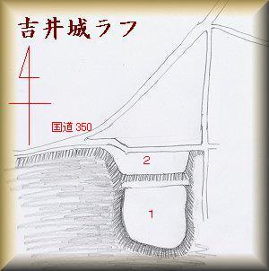 吉井城は国道350号線を挟んで剛安寺の南、郵便局の南側の、水田地帯に突きだした比高8mほどの台地上にある。台地の付け根に地蔵さんがあり、そこから廃屋の前を通って行くと、写真の空堀や土橋がある。この先が城址と呼ばれているところである。