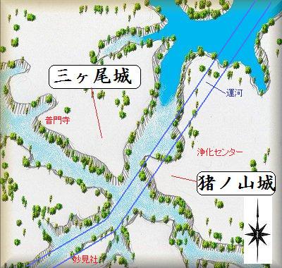 猪ノ山城は運河の開削によって消滅してしまったが、明治古地図や戦後直後の航空写真などから想像してみると、右の図のような台地先端部にあったと思われる。いかにも「猪の鼻」のような形状をした台地であり、「猪ノ山」という城名の由来はそうしたところにあったのかもしれない。しかし、城自体の詳しい構造は不明である。台地の先端部であったことからすると、それほど大規模な城館ではなかったようだが。