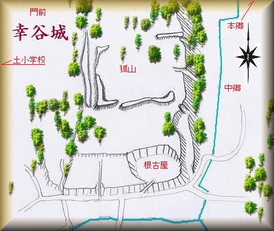 土小学校の東側の比高10mほどの台地が幸谷城の跡である。土小学校の東200m、万福寺の南200mほどの位置に当たる。南側に突き出した台地の中央部分辺りに土塁や堀などの遺構が残っているらしい。しかし、付近は住宅が立て込んでおり、城址と思われる部分も、柵に囲まれていて内部探索をすることはできなかった。そこで、『柏市史』に掲載されている測量図から推定してラフを描いてみると、だいたい、このような感じであるらしい。