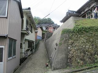 神社があるので、すぐに登れると思ったのだが、登り道が分かりづらく、発見するのに手間がかかってしまった。だが、よくよく注意してみれば、参道入口を発見することができる。民家の庇の下をくぐって行くようになっているので気が付きにくいのである。