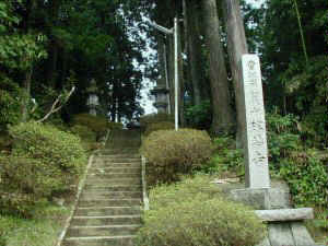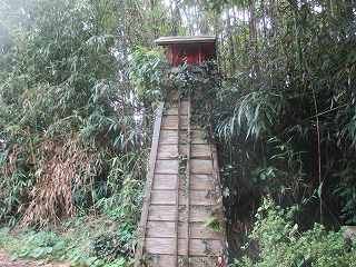 | 下の県道から見上げる片野尾城。 | 神社参道入口。知らないと分かりにくい。 |
