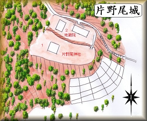 城は二段構造となっており、上の1郭が片野尾神社、その下の2郭が地蔵院の境内となっている。