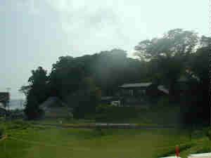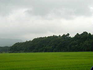 東側の海岸部の方から城址一帯を見てみた。手前の水田地帯はかつては沼沢地で、天然の要害となっていたと思われる。