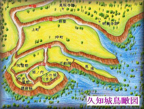 久知城を東側の台地先端部の方から鳥瞰してみた。先端の中枢部以外にも、町屋を取り囲んだ外郭分を持ち、佐渡では最大級の城郭の1つであった。図の二の堀と三の堀との間の区間が外郭部で、この部分は200m×400mほどある。
