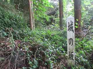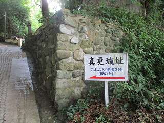 河崎神社の駐車場に車を停めて晃照寺の方に進んで行くと、そこに「←真更城址 これより徒歩2分(坂の上)」と書かれた案内が立てられていた。そこから登って行く坂は「城の坂」と呼ばれているようで、その表示もされている。