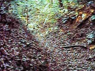 写真は、春日神社の裏手にある切り通しの道である。久米の集落から切り通しを登っていくと春日神社に到達する。この辺りが砦の跡らしい。東側はかなり急で切り落としたような崖になっている。神社から南に続く細い道を歩いていくと、かなり広い畑地があるが、ここも郭の跡といわれる。南端の入口付近には小規模だが土塁と空堀があり虎口を形成している。