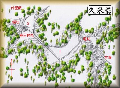 取香川南岸の丘陵上にある春日神社の周辺が城跡で、土塁・空堀・土橋・櫓台等が残されているが、それほど規模の大きなものではない。自然地形のままの部分も多い。この城も史料には現れてこず、城主の名もしれない。虎口などの形態から見て戦国期の築城といえるであろうか。位置から考えると、小菅城の出城の1つであったかもしれない。小菅城から続く道を走り、久米の集落にさしかかると、左手に未舗装の薄暗い山道が見える。ここを登っていくと、春日神社にたどり着ける。