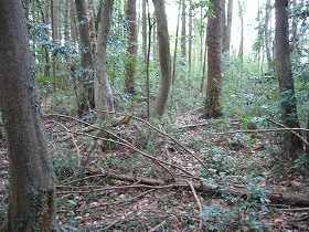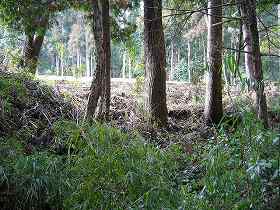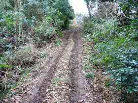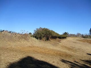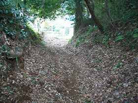 | Cの虎口。これは明らかに後世のものであろう。 | Eの部分を堀底から見たところ。ここから先の堀が埋められている。脇の部分の土塁は高さ2m以上の高いもので、こうした大きな土塁を崩して堀を埋めたのだというのが実感できる。 |