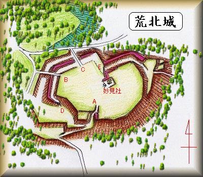 | (以前の記述) 荒北城は、荒北の集落の北端、長光寺と北に向かい合う比高15mほどの独立台地上にある。台地上は単郭であるがけっこう広く、直径150mほどの円形の土地で、現在は畑地になっている。 中央部に写真の妙見社があり、その周囲には土塁が残っている。また、郭の周囲には空堀が取り巻いており、南側には腰曲輪もある。郭への登り口は切り通しの道になっており、かつてはここに門があったのであろう。土塁や堀などの遺構の保存状況は比較的良好である。 荒北城は東伊予守朝胤の居城と言われているが、東朝胤についてはあきらかではない。 |