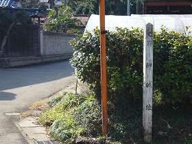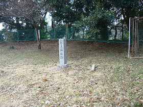 | 保育園の脇の広場の入口に残っている虎口。この広場が台地先端部にあり、主郭を置くのにふさわしい場所である。この写真だけ見ると、遺構が良好に残っているように見えるのだが、実際はこの部分だけである。 | 広場の中にある妙見社跡の碑。ちょうど北の端なので、鬼門除けにふさわしい場所である。 |
