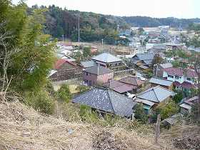 | 城址から台地下を見たところ。比高30m程度だが、非常に眺望がよく、遠くまで見渡すことができる。下の平野部は一望のもとにある。 | 台地中央部にある栗源小学校。「城郭体系」の図では、この小学校に本丸と二の丸があったように描いてあるが、現在では遺構は見られない。 |