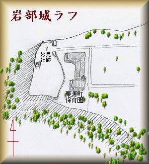 岩部城は旧栗源町役場の東側上にある比高30mほどの台地上にあった。台地の北西端を妙見社跡といい、「城郭体系」を見ると、ここではなく、もっと東側の栗源小学校の辺りに本丸と二の丸があったという。しかし、小学校の辺りにはすでに遺構がまったく見られなくなってしまっており、現状からでは何ともいえない。