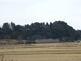 | 西の多古町三倉方面から見た御城。比高20mほどの台地で、右側が1郭となっている。 | 延命院の反対側辺りに城址入口を示す標柱がある。栗源町の城址にはだいたいこんな標柱がある。(といってもここと荒北城と岩部城だけだが。) |