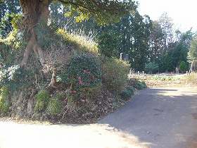 | 郭内からDの辺りを見たところ。城塁が一部削られているようで、横堀が途中で途切れているのが分かるだろうか。(右上端) | Bの虎口。一応、本来のものと見ておくが、車道を通すためにかなり改変されている。 |