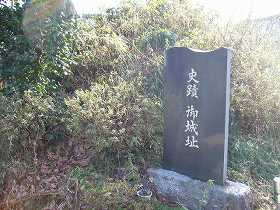 | 1郭の入口。脇の土塁は虎口の名残であろう。 | 左の土塁の脇に建つ「御城址」の石碑。昭和58年に西田部郷土史会が建てたものである。この辺りの城では。石碑が建っている城が少ないので、そういう意味では貴重なものである。 |
