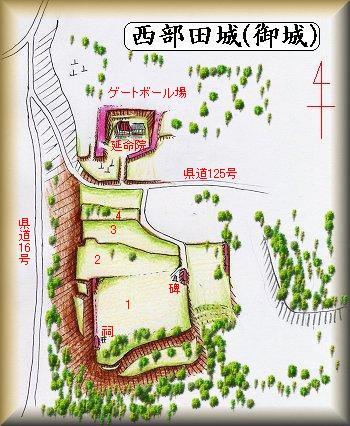 | (以前の記述)御城は、西田部の標高35mの台地城にあった居館状の城址で、通称御城と呼ばれている。延命寺の向かいに城址への入り口を示す標柱があり、道を少し上がると館の跡に着く。城址は畑地となり、遺構も明瞭ではない。単郭で周囲に土塁や空堀があったと思われる。千葉一族の田部次郎師時が築城し、天正の頃まで利用されていたという。 | |