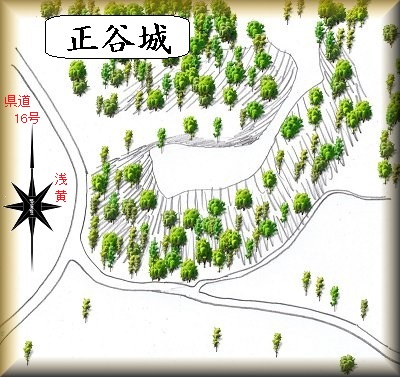 | (以前の記述)正谷城は、岩部城の800m南にある。岩部城の支城であったと思われる。比高25mの半島状台地の先端部で、ほぼ山林となっているが、郭や土塁、空堀などが残っているという。 | |