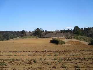 | 西側の道路沿いから城址方向を遠望してみる。一面に広大な畑となっている。 | 南側の切岸。あまり高くない。 |