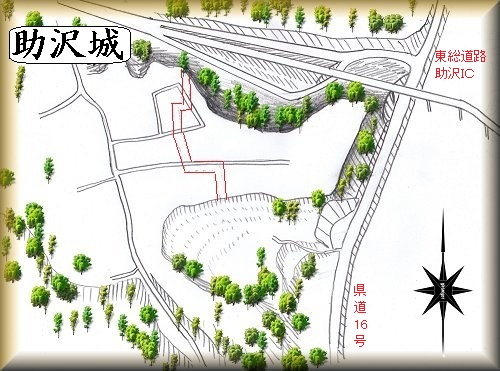 助沢城は、助沢地区の中心部にある。東総道路の助沢インターのすぐ南側のj比高20mほどの台地先端部が城址であるという。比高20mほどの東に突きだした半島状台地であり、台地上は畑地となっており、すっかり耕されてしまっていて遺構等は明確ではない。