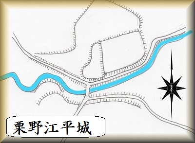 栗野江平城は、栗野江山城の西麓に築かれていた。栗野江山城の城主の平素の居館があったところであると考えられる。東西に流れている小川に臨む、北側の微高地を利用したもので、民家や水田となっており、耕地整理も行われているようで、本来の形状はよく分からなくなってしまっている。