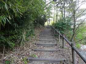 なお、整備事業の関係か、現在は山頂まで続く車道も付けられている。これを使用すれば山頂まで車で行くことも可能なのであるが、途中に「工事車両以外通行禁止」という看板があったので、あきらめて、下から登った。下から登っても10分ほどで城内に到達することは可能である。