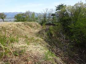 | 先端部からは眺望が利いており、国仲平野だけではなく、真野湾も両津湾もいっぺんに見下ろすことができる。。 | 折れをともなった4郭の城塁。 |