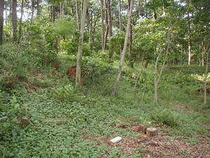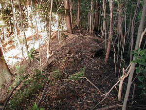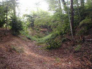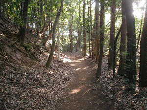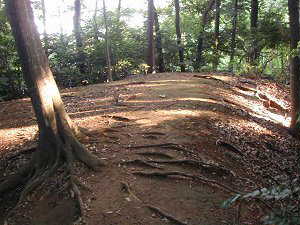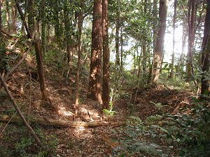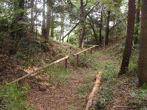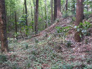 | 1の郭東南の細長く延びている部分の城塁。手前は堀になっており、深さ4mほどである。 | 同じく細長い部分の土塁を上から見た所。 |