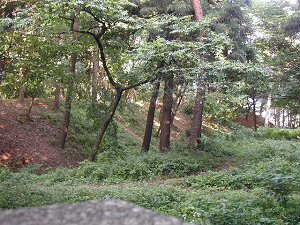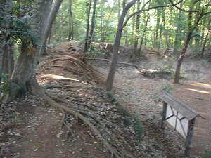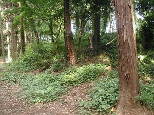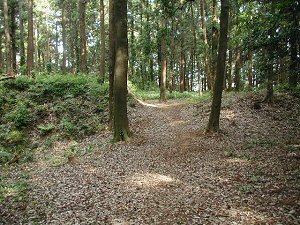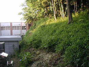 | 2の郭の南側下の横堀。外側の土塁の高さは1mほどしかないが、立派な横堀である。これが南側にはずっと延びている。 | 1郭西側の土塁。手賀沼病院建設によってだいぶ削られ、堀も埋められてしまっているが、それでも現在でもかなりの高さがある。横矢の張り出しの部分も何となく分かる。 |