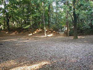 | 2の郭の南側3mほど下にある横堀。外側の土塁の高さは1m未満で、幅も3mほどしかないが、東南に向かってまっすぐ延びている。この上の部分が食い違い虎口になっている所である。 | 東側の台地端近くにある大きな櫓台。というよりも古墳なのかもしれない。高さ2mほどで、長軸10m近くある。茨城などでも郭の中央部にこのような土壇が鎮座している例があるが、何らかの関連性があるものかどうか。 |