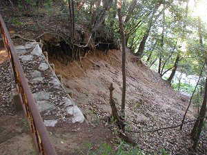 | 2郭から1郭虎口方向を見た所。間にあったと思われる堀は失われている。 | 1郭の南側は崩落によってだいぶ削られてしまっている。本来はもっと広かったのであろう。 |