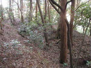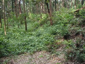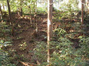 | 1郭内部の土塁の様子。周囲の土塁は内部からでも高く、3m近い高さがある。 | 1郭東側下の横堀。もともとこの横堀が全周していたのではないかと想像できる。正面奥の土壇が4の、櫓台のような部分である。 |