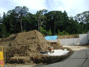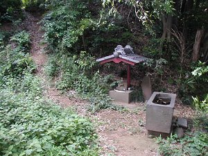 | 南側の腰曲輪にある「三郡境の不動様」。といっても、ただの石像である。もともとはお堂があったらしいが、火災によって焼失してしまったということである。 | 台地基部の方ではこのような工事が行われていた。マンションでも建つのであろうか。千葉城郭研究会のページでも松ヶ崎城保存運動の記事が掲載されているが、もう少しで城址自体が削られてしまいそうな所まで破壊が進んでいる。 |