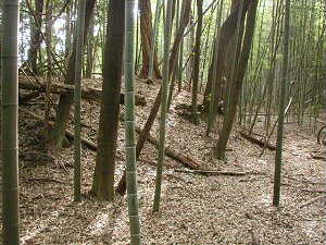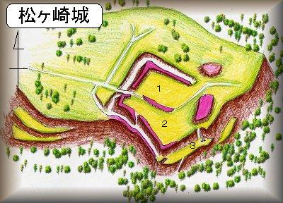 | (以前の記述)松ヶ崎城は、比高10mほどの台地の先端部にある。城址は私有地で手入れもされていないせいか、まったく藪の中といった感じであるが、注意してみると草が生い茂る中に空堀や土塁があるのが確認できる。堀は方形に区画され、単郭の居館であったかと思われる。堀の幅は5mほど、深さは現在では3mくらいしかないが、かつてはもっと深かったはずである。 | |