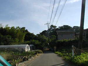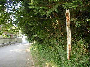 | 手賀沼病院の脇のヤブの前にある城址標柱。しかし、字はかすれてしまっており、何の標柱なのだか、知らない人は分からないであろう。数年前にはまだ字もよく読み取れたと思うのだが、後数年で、何の標柱かも分からなくなってしまうだろう。 | 5の郭と2の郭との間の堀を駐車場前の道から見た所。だいぶ埋まっている感じがする。 |