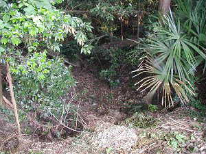 | 1郭の虎口。左右の脇は堀となっているが、土橋の部分がかなり広い。おそらく、後世に切り広げられているのであろう。 | 左の虎口の左側の堀。深さ3m、幅5mほど。北西の先端部はやや張り出して櫓台の形状のようにも見える。 |
