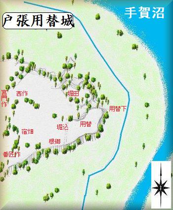 | 戸張地区の比高10mほどの台地突端部あたりにあったらしい。用替、堀田、堀込などの地名があり、また地元でも古城があったという伝承があるので、城址であることは間違いないと思われるのであるが、宅地化が進んでおり、現在、明確な遺構を見ることはできない。歴史等未詳であるが、戸張城と関連した施設であったろう。 | |