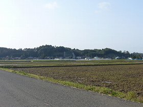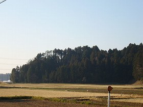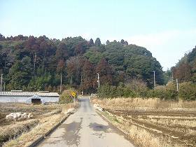 | (以前の記述)蕪木城は、金尾から松尾に向かう途中にあり、県道22号線(千葉八街横芝線)が城址の中央部分を2つに分断している。写真はその道路の西側から城址全体を見たところである。台地の比高は20mほどで、台地上への道は発見できなかったが、「蕪木城跡概念図」によると台地上の郭の周囲を二重に土塁と空堀が囲んでいたようである。 城主は干潟町の鏑木城の3代目である鏑木家胤の弟の常泰であったという。常泰は干潟の鏑木城からこの地に移ってきて蕪木城を築いた。「かぶらき」という地名がこの2つの城に共通しているが、何らかの関係があった土地なのだろう。 |