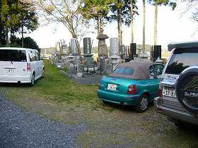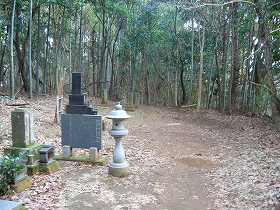 | 大蔵館のすぐ下から見た金尾城。比高20mほどで、いかにも城のありそうな山に見える。周囲は急斜面である。 | 2郭にある墓地。この奥に堀切があり、その先が1郭である。 |