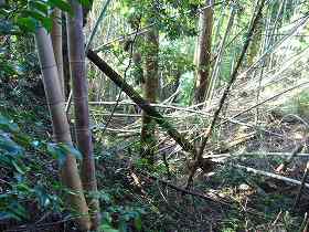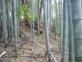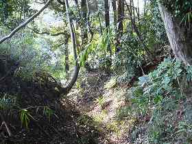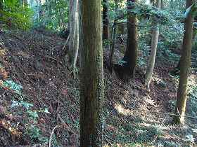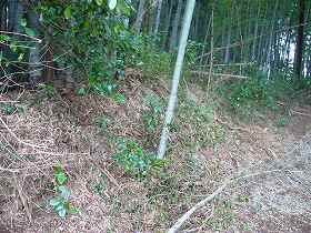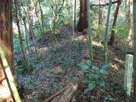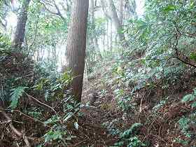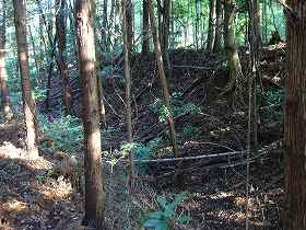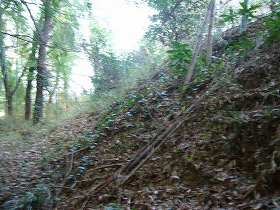 | 2の腰曲輪から下に降りる切り通しの道から1郭の城塁を見た所。1郭城塁は10mほどの高さの切岸となっている。 | 山麓部分にある横堀らしき部分。 |