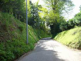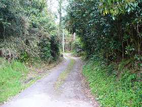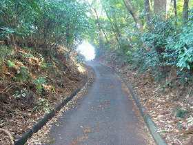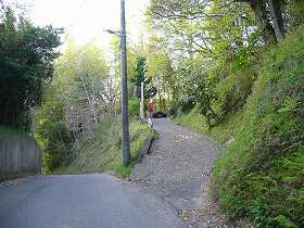 | 堀切1。南側の先端部に向かって三本の堀切が見られるが、どれも深さ2mほどの実に小さなものである。 | 北西台地基部の切り通しの道路。これは、もともとあった堀切を拡張したものであろうか。 |