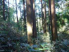 | (以前の記述) 金尾城は、松尾から成東に向かう県道112号線と、八街に向かう県道22号線とが合流する地点の南側にそびえている比高20mほどの細長い台地上にあった。台地上はまったくの山林であるが、台地下には「金尾市民の森」といった看板が出ている。 山菜取りなどで市民に提供されている山であるらしい。とはいえ登り口が分からなかったので直登したのだが、上に登ってみると、畑と祠があり、そこに行くためのいい道が北西側についていた。 台地上はかなりの広さがあるが、明確に城館遺構と思われるものは見つからなかった。祠のある部分が塚状の高まりになっているのだが、遺構とは断定できないと思う。 坂田城の支城の1つだと思われるが、城主等については未詳である。 |