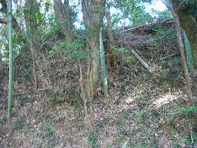 台地基部には上端幅5mほどもある土塁が配されているが、この土塁、現状では高さ1mほどしかない。幅が十分にあるというのに、台地基部がこの状態では、容易に敵に侵入されてしまう。おそらくここにはかつて深い堀が存在していたのではないだろうか。近世以降の耕地化によって、土塁を崩して堀を埋めるといったことが行われたのだろうと推測できる。
