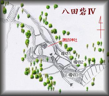 八田砦Vのさらに南西側、切り通しの道路を挟んだ台地上に諏訪神社がある。これが八田砦Wということになっている。諏訪神社の本殿が建っている部分は、長軸30mほどのちょっとした空間で、周囲は切岸で囲まれている。