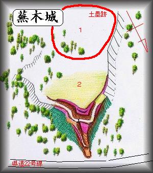 県道の辺りから南西側に台地を登っていくと、すぐに立派な堀と土塁が見えてきた。土塁は1の部分で北東側に出張っており、櫓台の形状を示している。形態からして、ここが城内の入口に当たるかと思われる。この立派な横堀を見ると、「なかなかいい城ではないか」という期待が膨らんでくるのだが、残念ながら遺構はこれだけである・・・。この奥の台地を進んで行っても、後は何にもないのである。城であるからには少なくとも南側の台地基部の方にも、明確な区画性を伴った遺構がなければならないはずであるし、広大な台地を区画するために、数郭の遺構があってもよさそうなものである。それなのに、何にもないのである。このことをどう見るべきか。